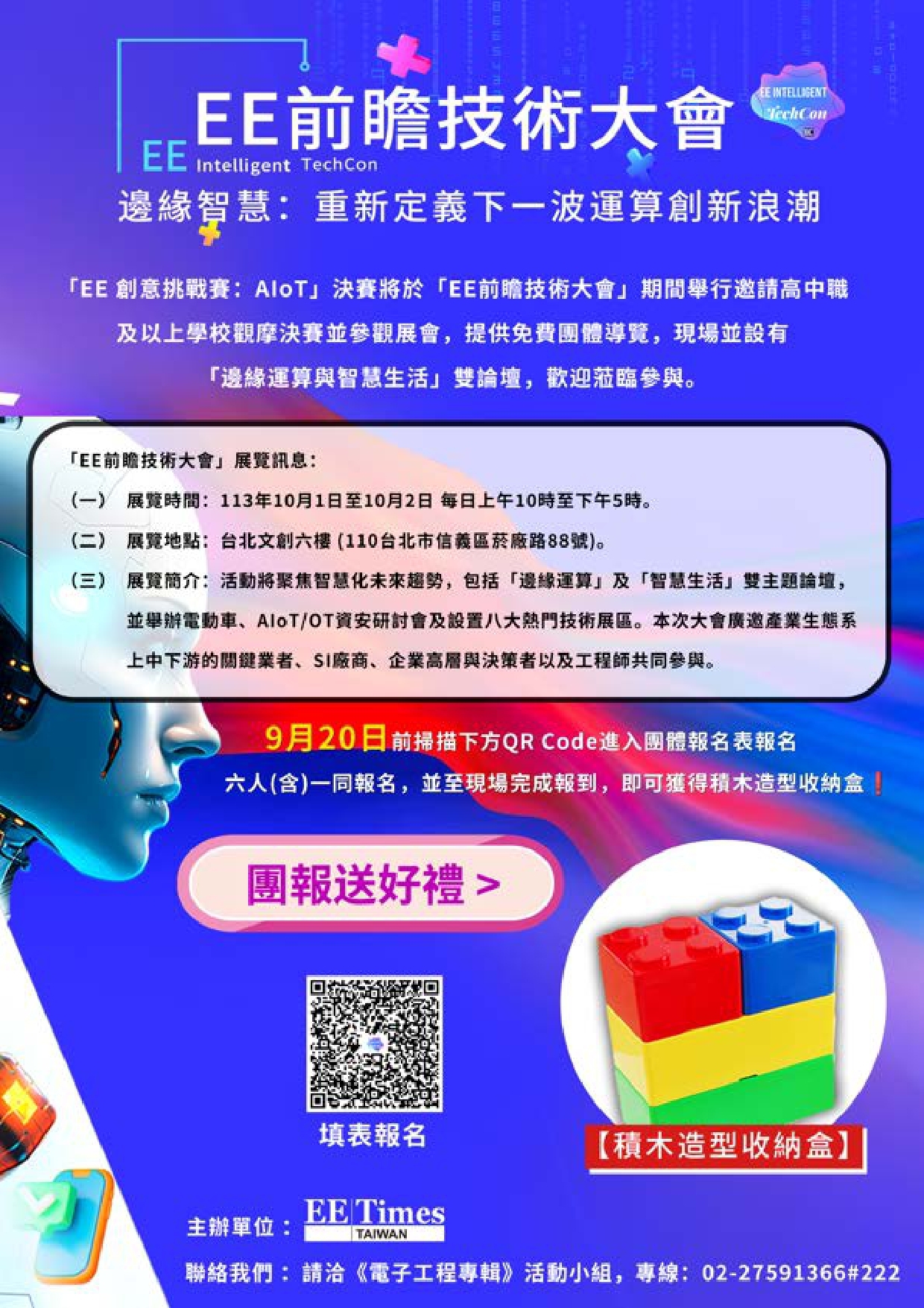 二、 決賽將於今年(113年)10月1日至2日在台北文創六樓舉行,作為「EE前瞻技術大會」的一部分。這場為期兩天的活動預計將吸引上千人參與,會中將聚焦智慧化未來趨勢,包括「邊緣運算」及涵蓋食、衣、住、行的「智慧生活」雙主題論壇,並舉辦電動車、AIoT/OT資安研討會及設置十大熱門技術展區。