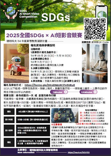本活動結合「SDGs × AI × 短影音」,鼓勵學生運用腳本生成、影像製作、動畫設計等AI工具,創作兼具管理專業與永續思維的數位內容,展現其於綠色行銷、智慧管理、社會責任、永續經營等領域的創新應用。